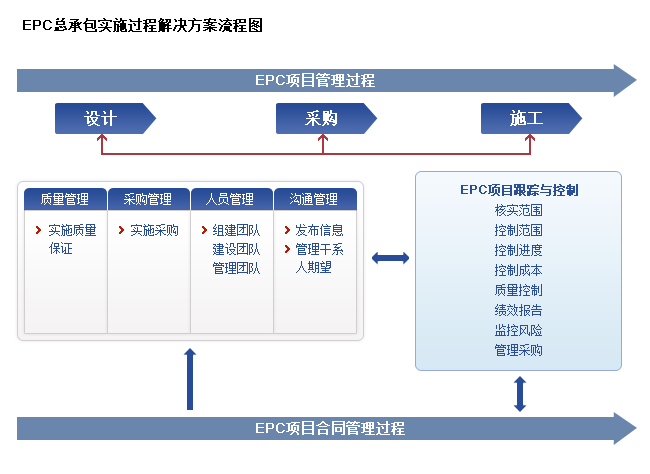 所谓EPC工程总承包项目指的是公司受到业主委托,按照合同的约定对工程建设项目的设计、采购、施工、试运行等全过程或者是若干阶段的承包,并对整体工程的质量、安全、费用、进度等全权负责。