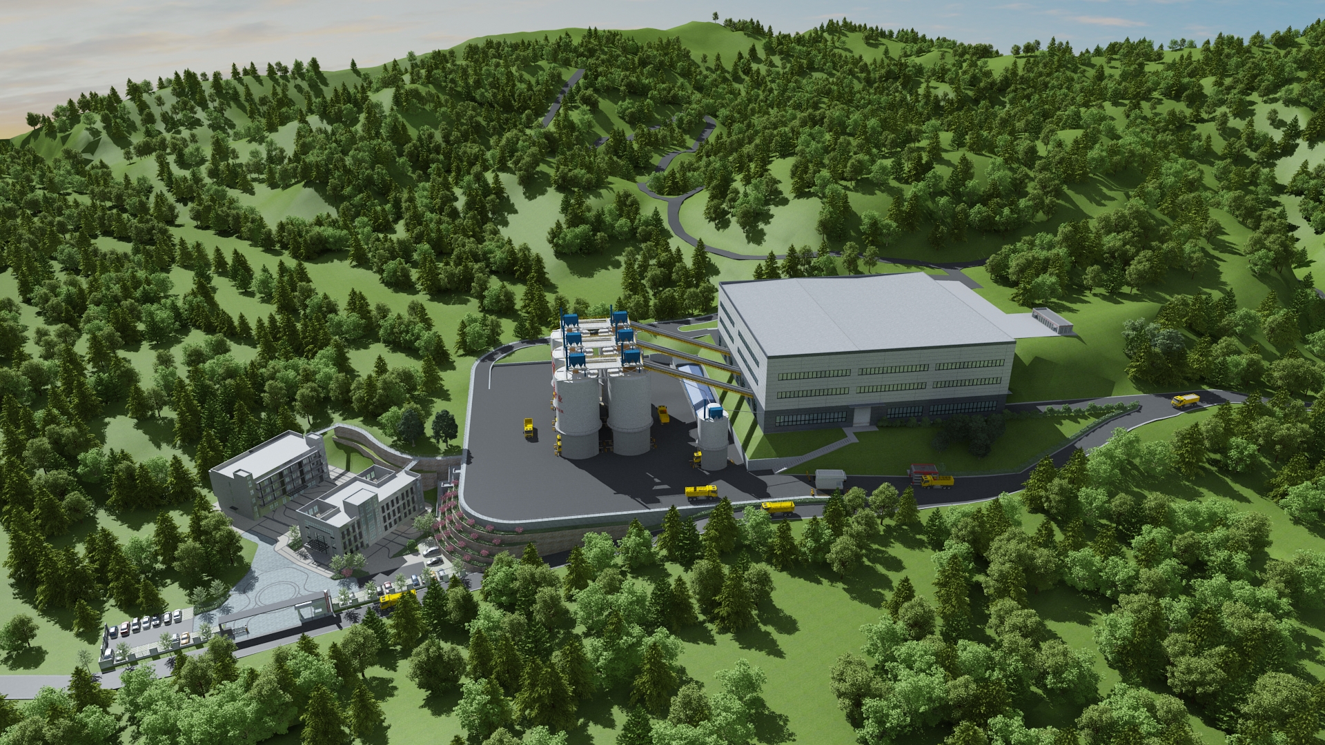 该项目由三铭重工提供节能高效、绿色环保、智能安全的整体解决方案。围绕“创新、协调、绿色、开放、共享”的绿色矿山建设理念,采用分段破碎、多级筛分工艺。